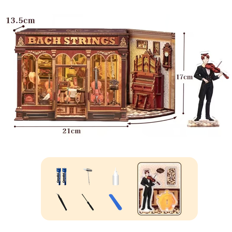 Package Includes: 1 * DIY Miniature House Kit + Assembly Tool Kit (Batteries, Tweezers, Screwdriver, Sanding Strip, Hammer, Glue) + Instruction Manual + LED Light Set + Bonus Acrylic Standee